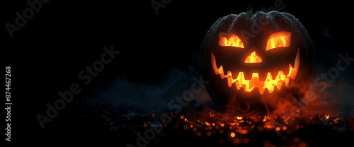 © FATNA, Naklejka premium Halloween pumpkin with scary face on black background.