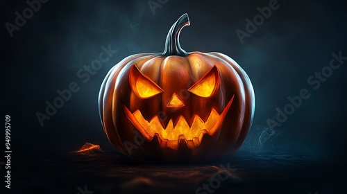 © Thanthara, Naklejka premium Halloween pumpkin with scary face on dark background.