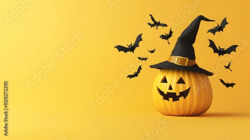 Fototapeta premium Halloween Pumpkin with Witch Hat and Bats