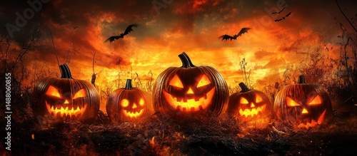 Fototapeta premium Halloween Pumpkins and Bats Against a Fiery Sunset