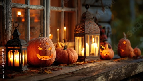 © Sukses, Obraz premium Halloween pumpkins and lanterns on a windowsill