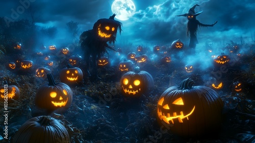 © romet6, Fototapeta premium Halloween pumpkins and witch on dark forest background. 3D rendering.