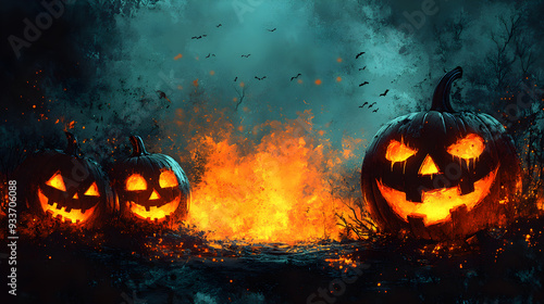 Fototapeta premium Halloween pumpkins at night with flames in grunge style giving a mysterious...