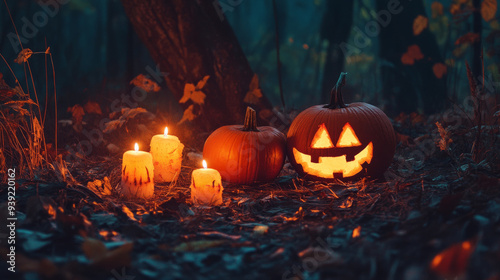 © MEMO AI, Fototapeta premium Halloween pumpkins decorations and party supplies with lanterns, candles for a memorable celebration.Halloween is celebrated on October 31st with costumes, trick-or-treating, and spooky decorations