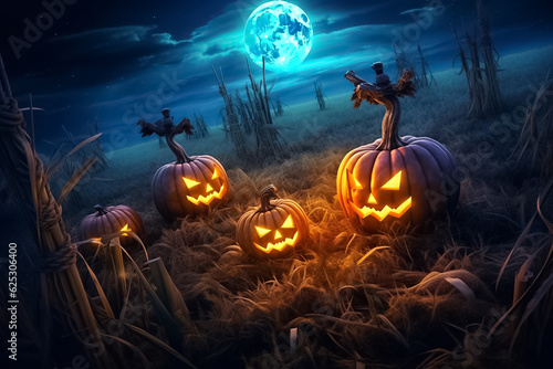 Fototapeta premium Halloween pumpkins Devil on dry rice straw in Horrow Halloween night. Generative AI.