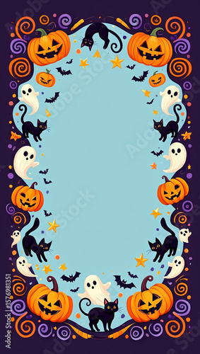 Fototapeta premium Halloween pumpkins ghosts black cats bats festive border image
