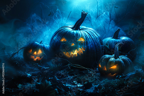 Naklejka premium Halloween pumpkins glowing in a spooky forest at night