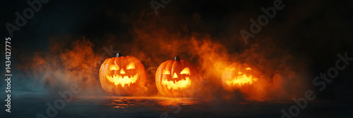 © TheseusStock, Naklejka premium Halloween pumpkins illuminated against a dark background with a copy space area, a banner design.
