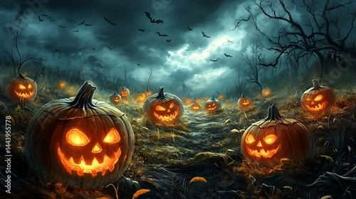 © kaling, Fototapeta premium Halloween pumpkins illuminated dark forest
