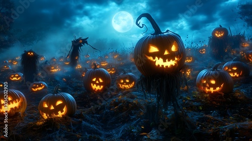 © romet6, Naklejka premium Halloween pumpkins in the forest at night. 3D rendering.