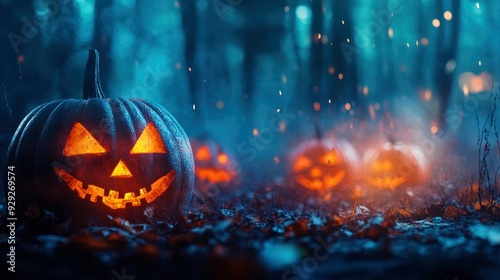 © MUdaylah, Fototapeta premium Halloween pumpkins in the forest at night.Halloween background with Evil Pumpkin. Spooky scary dark Night forrest. Holiday event halloween banner background concept with generative ai