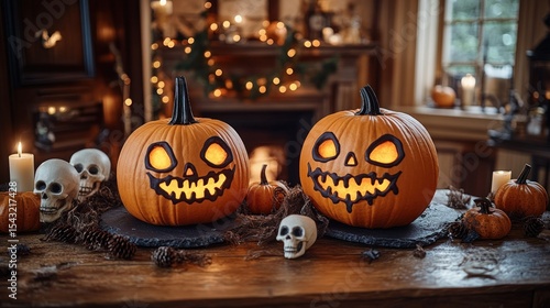 Fototapeta premium Halloween pumpkins on a rustic table, lit with candles and skulls