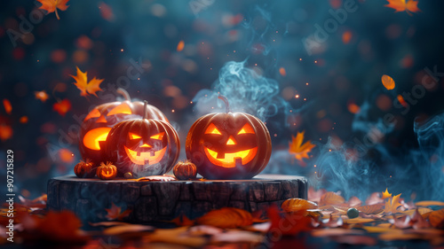 © Kanurism, Fototapeta premium Halloween pumpkins on podium with smoke and autumn leaves on mystical background