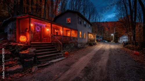 © Vitalii, Naklejka premium Halloween pumpkins on the street. Glowing outdoor decorations with pumpkins and orange garlands on the house porch