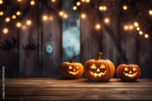 © Rudsaphon, Obraz premium Halloween pumpkins on wooden table with bokeh lights background.Generative Ai