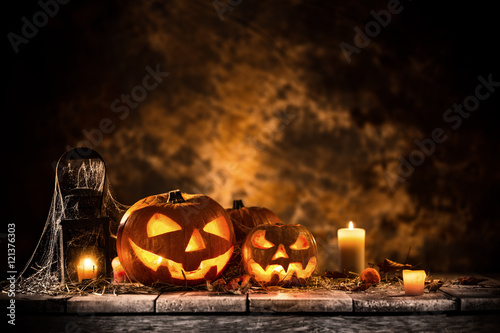 Naklejka premium Halloween Pumpkins still-life background.