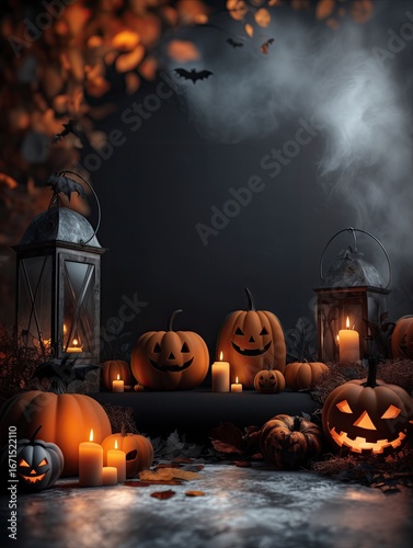 Naklejka premium Halloween pumpkins with lanterns and candles