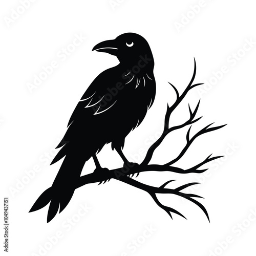 © Nayon Chandro Barmon, Fototapeta premium Halloween Raven on Branch vector silhouette with white background