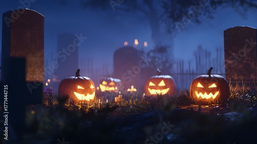 Fototapeta premium Halloween render: glowing pumpkins nestled between cemetery stones, thick fog swirling behind moonlit night, ultra-sharp high-res detail ready for print or screen.