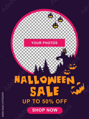 © suicidestock, Naklejka premium Halloween sale banner. Halloween background with tombstone, pumpkin, haunted house and full moon. Flyer or invitation template for Halloween party. silhouette Vector illustration.