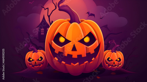 © Pixora Labs, Fototapeta premium Halloween scary pumpkin vector style, candles and bats in a dark forest at night