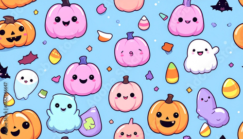 © Wisnu, Fototapeta premium Halloween seamless background, cute pumpkins, candy, ghost icons, pastel color scheme