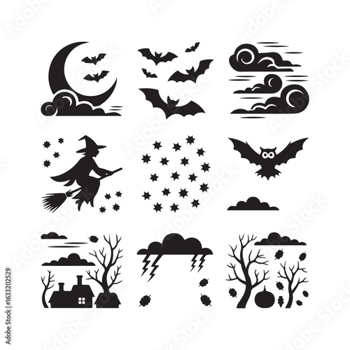 Naklejka premium Halloween Silhouette Icons Set Witch Bats Moon Stars Clouds House Trees Weather and Pumpkin Vector Design