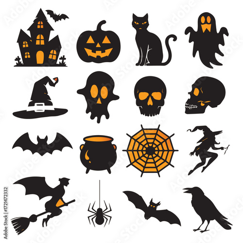 Fototapeta premium Halloween Silhouette Set Haunted House Pumpkin Witch Cat Ghost Spider Skulls Bat Cauldron