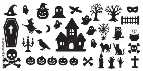 © Aquavisionweath6, Fototapeta premium Halloween silhouette vector set featuring spooky trees, haunted houses, carved pumpkin faces, spider webs, bats, and pumpkin shapes. Halloween icon. Halloween icon set. Silhouette style.