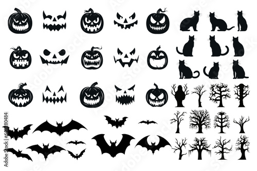© Giu Studios, Naklejka premium Halloween Silhouettes: Black Cat, Pumpkin, Jack O Lantern Face, Scary Tree, Bat, Vampire Vector Illustration in a Set of Black Icon and Character - isolated on transparent background, png