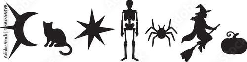 Fototapeta premium Halloween silhouettes black cat skeleton spider witch pumpkin