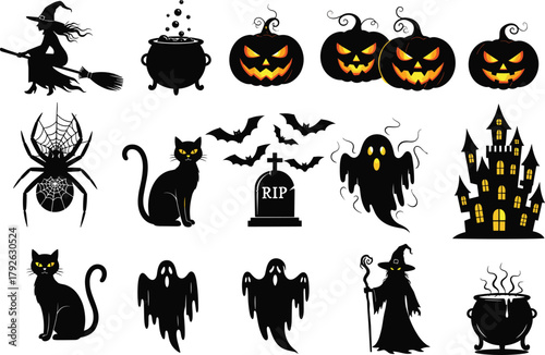 © Amit World, Fototapeta premium Halloween silhouettes, spooky icons, witch flying, haunted house, ghost shapes, black cat, jack-o'-lantern, RIP gravestone, cauldron, spider web