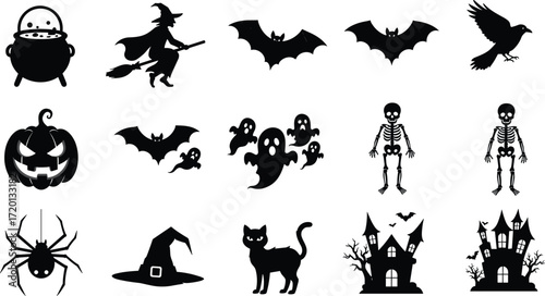 Fototapeta premium Halloween silhouettes, spooky icons, witch vector, ghost illustration, pumpkin design, haunted house, bat graphic, skeleton art, spider web, black cat