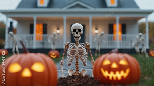 Obraz premium Halloween skeleton decoration in front of a spooky house.
