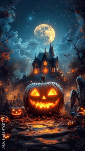 Fototapeta premium Halloween spooky night scene with a glowing pumpkin, eerie haunted house, floating ghosts, and flying bats, creating the perfect atmosphere for Halloween-themed or ads in a Halloween commercial