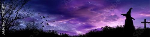 © MMerellinn, Fototapeta premium Halloween spooky night scene with a wizard hat silhouette, flying birds, bare tree, and graveyard cross against a dramatic purple sunset sky.