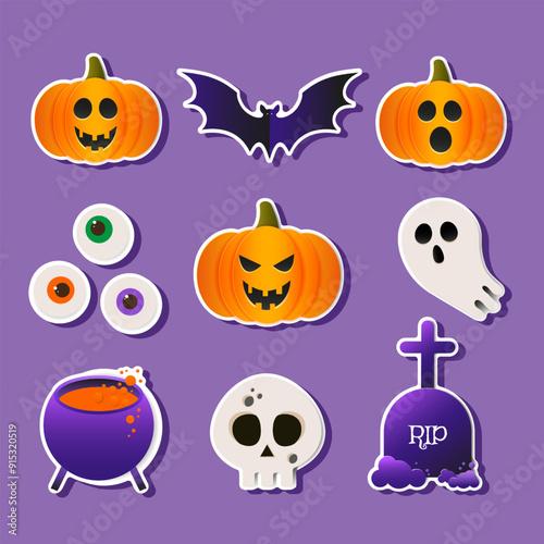 © Svitla, Naklejka premium Halloween sticker set. Pumpkin, ghost, bat. Vector illustration in cut paper style