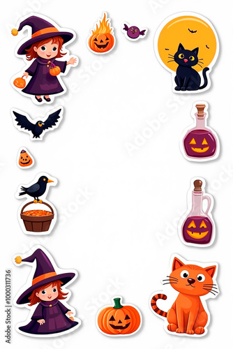 © Ira Creator, Naklejka premium Halloween sticker sheet for preschoolers with big shapes and whimsical elements like witch, cat, raven, elixir on a white background, empty space for text