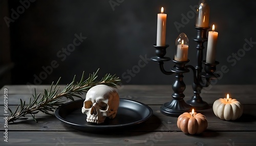 Obraz premium Halloween still life featuring a skull on a plate, lit candles in a...