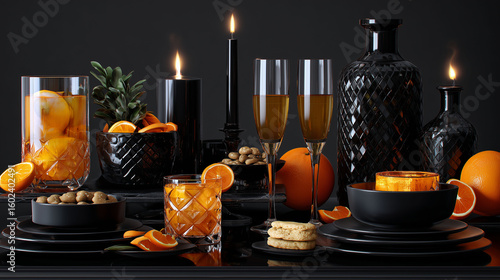© Anup, Fototapeta premium Halloween table setting with oranges and champagne