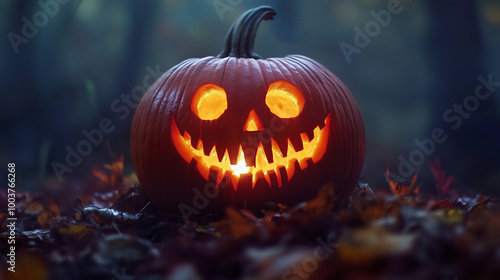 © tsuyoi_usagi, Naklejka premium Halloween. The glowing jack-o'-lantern rests on the ground, surrounded by autumn leaves.