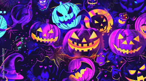 Fototapeta premium Halloween theme set filled with vibrant jack-o-lanterns and eerie decorations. Glowing pumpkins, bats, and whimsical elements create a playful autumn illustration.
