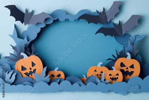 Fototapeta premium Halloween themed cut-out design with pumpkins and bats.