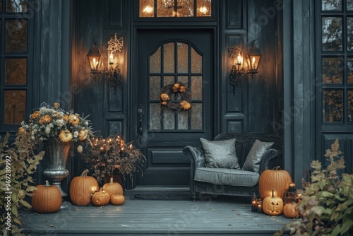 Obraz premium Halloween-themed front porch halloween decorations pumpkins.