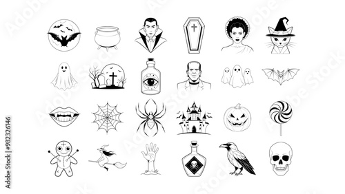 © f., Naklejka premium Halloween-themed icons set, black and white, spooky vector collection