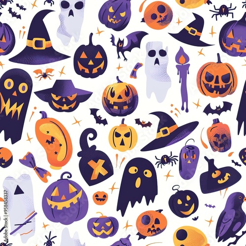 Fototapeta premium Halloween-themed pattern with pumpkins, ghosts, and spooky elements. AI...