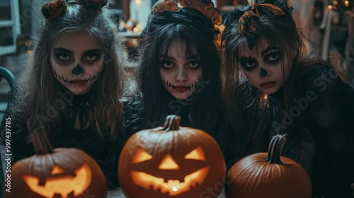 Fototapeta premium Halloween Themed Photoshoot with Pumpkins and Witches in the Forest