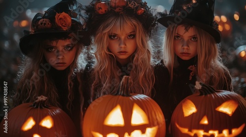 Fototapeta premium Halloween Themed Photoshoot with Pumpkins and Witches in the Forest