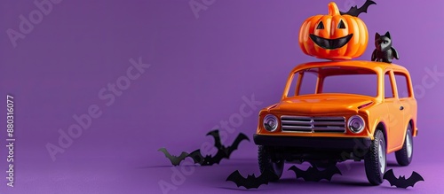 © HN Works, Fototapeta premium Halloween-themed toy car featuring a pumpkin atop it, with bats on a purple backdrop, suitable for adding text in the copy space image.