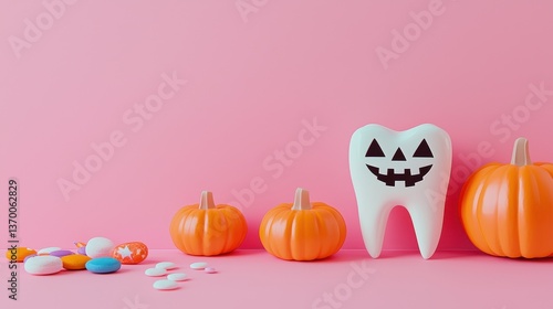 Fototapeta premium Halloween Tooth with Pumpkins and Colorful Candy on Pink Background